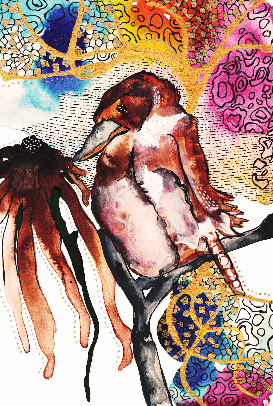 Cheeky, bright Kooka- Ink, watercolour and mark making fine art prints on Ilford Galerie Textured Cotton Rag matte 310gsm paper. Prints are available in sizes A4, A3 and A0